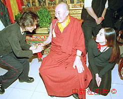 齊秦、王祖賢拜望西藏那倉(cāng)活佛(圖文) 2000年4月14日 09:18 ![]() 臺(tái)灣著名歌星齊秦(左)和王祖賢(右)十二日晚在北京拜望中國(guó)藏語(yǔ)系高級(jí)佛學(xué)院副院長(zhǎng)那倉(cāng)·向巴昂活佛。齊秦表示,他和王祖賢將在今年晚些時(shí)間在西藏拉薩舉行藏族式的婚禮。中新社記者 吳新華 攝