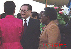 中國國家主席江澤民4月24日傍晚(當?shù)貢r間)抵達約翰內(nèi)斯堡,受到南非外長和當?shù)厝A人的熱烈歡迎。中新社記者 彭偉祥 攝