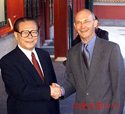 中歐十九日達(dá)成中國(guó)入世協(xié)議后,江澤民主席在會(huì)見(jiàn)歐盟貿(mào)易委員拉米一行。 2000年5月19日 21:21 ![]() 中國(guó)與歐盟十九日達(dá)成了中歐之間關(guān)于中國(guó)加入世貿(mào)組織的雙邊協(xié)議后,國(guó)家主席江澤民在北京中南海會(huì)見(jiàn)歐盟貿(mào)易委員拉米一行。 |