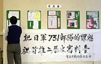 圖:東京舉行七三一部隊細(xì)菌戰(zhàn)展示會 2001年12月21日 20:01 ![]() 一百八十名中國受害者控告原日軍七三一部隊細(xì)菌戰(zhàn)暴行的訴訟將于近日結(jié)審,為支持中國原告的正義要求,日本有關(guān)民間團(tuán)體21日在東京舉行七三一部隊細(xì)菌戰(zhàn)展示會,揭露七三一部隊在中國犯下的滔天罪行。圖為從中國受害地湖南省常德市寄來的橫幅及介紹七三一部隊培殖炭疽菌的介紹材料。中新社記者 陶光雄 攝 |