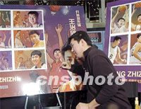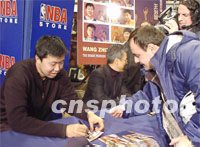 ![]() 今天中午,達(dá)拉斯小牛隊的高大中鋒王治郅出現(xiàn)在紐約市中心NBA專賣店里。他是第一個被美國職業(yè)籃球隊選中的中國球員。為表彰他的卓越才華和對籃球運(yùn)動的貢獻(xiàn),一套以他個人肖像為主題的法定郵票今天開始公開發(fā)售。中新社記者 陳建 攝