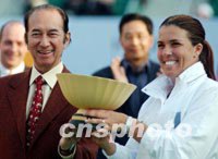 圖:“賭王”何鴻燊為卡佩雅蒂頒獎(jiǎng) 2002年01月07日 15:00 ![]() 排名女子網(wǎng)球世界單打第二的美國(guó)名將卡佩雅蒂,1月5日在香港女網(wǎng)挑戰(zhàn)賽決賽中獲得冠軍,“賭王”何鴻燊為其頒獎(jiǎng)。中新社傳真 任晨鳴 攝 |