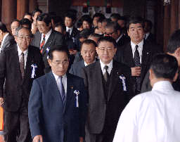 繼小泉后日本88名國會議員集體參拜靖國神社(圖) 2002年04月23日 10:26 ![]() 日本國會議員集體參拜 中右為自民黨干事長山崎拓 中新網(wǎng)北京4月23日消息:由日本保守派議員組成的“大家都來參拜靖國神社國會議員會”的成員今天上午集體參拜了靖國神社。 據(jù)共同社報道,自民黨干事長山崎拓、保守黨干事長二階俊博和民主黨的小林憲司等88名參眾兩院議員,91名國會議員的代理人以及國家公安委員長村井仁參加了靖國參拜。 日本首相小泉純一郎21日上午突然參拜了靖國神社,引起中國和韓國政府的強烈不滿和抗議。 位于東京九段北的靖國神社內(nèi)供奉著日本明治維新以來歷次對外戰(zhàn)爭中246萬多戰(zhàn)死者的牌位,其中包括東條英機等甲級戰(zhàn)犯。