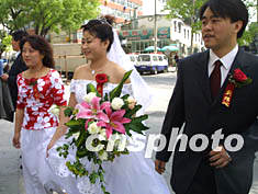 圖:北京另類新人“走婚”創(chuàng)紀錄 2002年05月07日 20:25 ![]() 五一假期,一對身穿禮服的新人舍棄豪華婚車,在家人陪同下從洋橋家中走到西單舉行婚禮,在假日婚潮中創(chuàng)造了一項“走婚”紀錄。中新社記者 鄭萍萍 攝