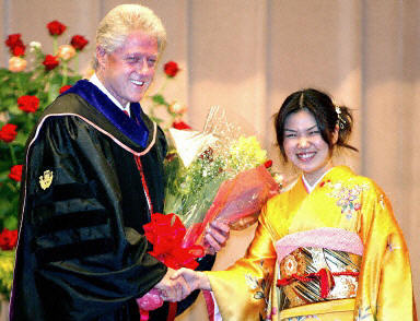 圖:美國(guó)前總統(tǒng)克林頓在日本接受名譽(yù)博士學(xué)位 2002年05月21日 17:14 21日在東京美國(guó)前總統(tǒng)克林頓被日本大學(xué)授予名譽(yù)法律博士學(xué)位。據(jù)悉,克林頓21日晚些時(shí)候還將與日本首相小泉純一郎舉行會(huì)談。圖為身穿傳統(tǒng)和服的大學(xué)生給克林頓獻(xiàn)花。法新供中新圖