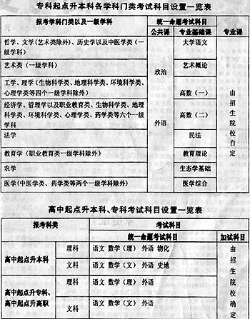 全國(guó)成人高考科目設(shè)置明年將作進(jìn)一步調(diào)整(附表) 2002年06月05日 16:09 ![]() 中新網(wǎng)北京6月5日消息:據(jù)中國(guó)教育報(bào)報(bào)道,為了使考試科目的設(shè)置更加適應(yīng)成人高等教育的特點(diǎn),更有利于提高成人高校招生的生源質(zhì)量和今后的培養(yǎng),有利于考試的組織和管理,從2003年起中國(guó)成人高校招生考試科目設(shè)置做進(jìn)一步的調(diào)整: 1.?破瘘c(diǎn)升本科統(tǒng)考科目按學(xué)科門(mén)類設(shè)置,不再按生源類別設(shè)置。統(tǒng)考科目為政治、外語(yǔ)和專業(yè)基礎(chǔ)課3門(mén)。專業(yè)基礎(chǔ)課根據(jù)各學(xué)科門(mén)類的特點(diǎn)設(shè)置8門(mén)(見(jiàn)專科起點(diǎn)升本科各學(xué)科門(mén)類考試科目設(shè)置一覽表),由招生院校按專業(yè)的需要規(guī)定考生應(yīng)試其中一門(mén)。 2.高中起點(diǎn)升?(含高職)、高中起點(diǎn)升本科考試按文科、理科分別設(shè)置統(tǒng)考科目。其中,高中起點(diǎn)升專科(含高職)統(tǒng)考科目為語(yǔ)文、數(shù)學(xué)(分文科類、理科類兩種,下同)、外語(yǔ)3門(mén),主要考查考生是否具備接受高等?茖哟谓逃淖罨疽?紤]到本科教育與?平逃囵B(yǎng)目標(biāo)和教學(xué)要求的不同,報(bào)考高中起點(diǎn)升本科的統(tǒng)考科目的理科類考生增加一門(mén)“物理化學(xué)綜合課”(簡(jiǎn)稱物化),文科類考生增加一門(mén)“歷史地理綜合課”(簡(jiǎn)稱史地)(見(jiàn)高中起點(diǎn)升本科、?瓶荚嚳颇吭O(shè)置一覽表)。 3.各類考生除參加上述規(guī)定的統(tǒng)考科目考試外,招生院?筛鶕(jù)專業(yè)要求自行確定是否再加試一門(mén)考試科目。如需加試,招生院校必須在招生簡(jiǎn)章中注明并自行命題和組織考試,于錄取工作開(kāi)始前,向有關(guān)省級(jí)成人高校招生辦公室提交加試合格考生名單。錄取時(shí),省級(jí)成人高校招生辦公室根據(jù)加試合格考生名單向招生院校投檔,招生院校根據(jù)考生參加統(tǒng)考的成績(jī),由高分到低分擇優(yōu)錄取(藝術(shù)類和體育類專業(yè)在考生文化課符合要求的基礎(chǔ)上,按加試專業(yè)課成績(jī)從高分到低分錄取)。不需加試的院校,按考生參加統(tǒng)考科目的成績(jī)錄取。 4.統(tǒng)考科目除?粕究瓶荚嚨拿穹ㄔ囶}由司法部命制外,其他試題均由教育部統(tǒng)一命制。各門(mén)試題滿分為150分;高中起點(diǎn)升本科、?频慕y(tǒng)考科目每門(mén)考試時(shí)間為120分鐘,?粕究泼块T(mén)考試時(shí)間為150分鐘。