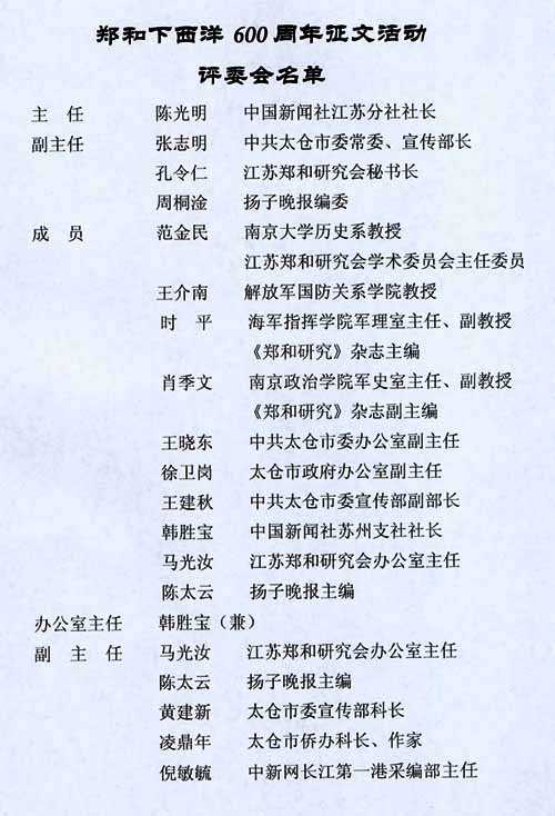 “鄭和下西洋600周年”征文啟示 2002年07月05日 10:36 ![]() 鄭和下西洋600周年征文活動評委會名單 為紀念鄭和下西洋600周年,弘揚鄭和開放和探險精神,進一步提升鄭和七下西洋起錨地太倉的知名度,促進太倉的兩個文明建設(shè)和經(jīng)濟發(fā)展,特舉行征文活動。 一、征文時間 從2002年7月11日起(鄭和下西洋紀念日)至2003年7月11日止。 二、征文內(nèi)容 圍繞鄭和七下西洋起錨地太倉與鄭和,從歷史與現(xiàn)實的結(jié)合上,從跨越600年的時間和空間中,從不同視角充分展示鄭和精神及給太倉歷史、經(jīng)濟、文化等方面帶來的影響。 三、征文形式 1、學術(shù)論文類; 2、文學類,包括小說、散文、隨筆、詩歌、故事、盈聯(lián)等; 3、新聞類,包括消息、通訊、特寫、專訪、述評等。 四、征文字數(shù) 論文一般不超過5000字;文學作品一般不超過3000字(長、中篇小說例外);新聞一般不超過1500字。 五、征文刊用 征文作品在中新江蘇網(wǎng)、中新網(wǎng)長江第一港、揚子晚報“聚焦蘇錫!睂0妗ⅰ多嵑脱芯俊冯s志刊用。 六、征文評比 征文頒獎活動在2003年9月份舉行,評出論文類、文學類、新聞類一等獎各一名,獎金3000元;二等獎各三名,獎金1500元;三等獎各五名,獎金500元,另評出榮譽獎若干名。 七、征文請寄江蘇省太倉市體育東路58號,中新網(wǎng)長江第一港編輯部,郵編215400。另電子文檔以word形式保存,寄jiangzhenjiang@chinanews.com.cn作者請自留底稿,所有應(yīng)征作品一律不退稿。 八、本次征文活動解釋權(quán)在征文活動組委會。 主辦單位:太倉市委、市人民政府 中國新聞社江蘇分社 揚子晚報“聚焦蘇錫!本庉嫴 江蘇鄭和研究會 二OO二年七月一日