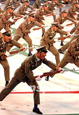 圖:駐港部隊“刺殺團體操”為軍樂團表演添彩 2002年07月06日 20:06 ![]() 七月六日晚,解放軍駐港部隊參加中國人民解放軍軍樂團在香港的演出,他們表演的“刺殺團體操”威風凜凜,為軍樂團演出錦上添花。潘索菲 攝
