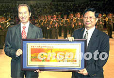 ![]() 中國人民解放軍軍樂團(tuán)八日晚在澳門綜藝館舉行盛大演出,澳門娛樂旅游有限公司董事總經(jīng)理何鴻燊向軍樂團(tuán)贈送澳門全景畫框。李剛 攝