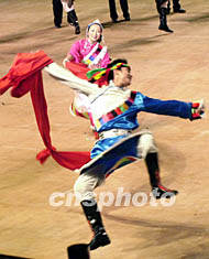 ![]() 中國人民解放軍樂團(tuán)八日在澳門綜藝館演出活潑歡快的藏族舞蹈。李剛 攝