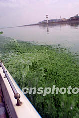 圖:昆明滇池個別水域綠藻泛濫 2002年07月16日 19:27 ![]() 昆明滇池個別水域最近綠藻泛濫,污染嚴重。快艇駛過時激起綠色的浪花,臭氣熏天。中新社記者 史利 攝