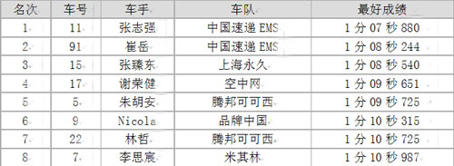 從練習(xí)賽開始一直勢(shì)頭不錯(cuò)的范高翔“不幸”遭遇賽車的后懸掛故障,沒能在第二階段排位賽中跑出成績(jī),最終排在第9。夢(mèng)龍車隊(duì)65號(hào)車手羅兆峰也因?yàn)橘愜嚨墓收蠜]有參加第二階段排位賽,將從第10位發(fā)車。朱胡安在自己的第12圈跑出1分09秒725的個(gè)人最好成績(jī)后遭遇變速箱故障,遺憾地名列第五。謝榮健、Nicola、林哲和李思宸分別取得第四和六至八名。