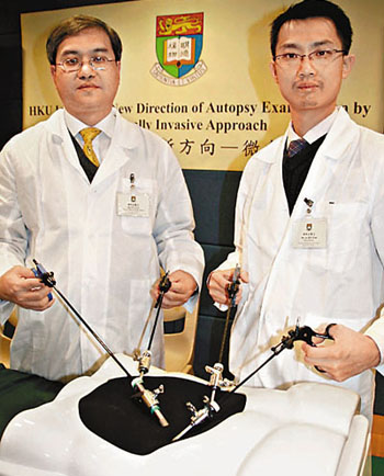 為了讓家屬較易接受驗(yàn)尸,港大外科學(xué)系的微創(chuàng)專家研究利用微創(chuàng)技術(shù)驗(yàn)尸,在腹部開四至五個直徑0.5至1厘米的傷口,利用腹胸腔鏡或內(nèi)窺鏡檢視胃、肝、腸和胰臟等胸腔內(nèi)的器官以尋找死因。