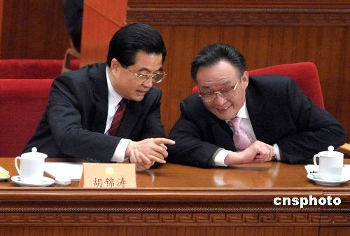 圖:胡錦濤與吳邦國(guó)在政協(xié)閉幕會(huì)上交談