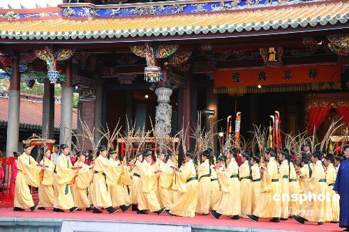 十月五日舉行的臺(tái)北祭孔大典與往年不同,佾舞及雅樂演出由六佾變?yōu)榘速,即由六行六列三十六名佾生,增加到八行八列六十四名佾生。中新社發(fā) 楊旭 攝