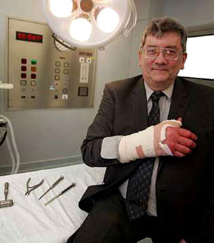 他憶述說(shuō):“我用了三十秒左右催眠自己,之后便全身都失去了知覺(jué),除了(右)臂。我感覺(jué)到手術(shù)師為我做推拿──然后便聽(tīng)見(jiàn)骨頭裂開(kāi)的聲音。我聽(tīng)見(jiàn)他說(shuō),‘可以拿那把鋸子給我嗎?’,然后我想象出他手中持著那把大得可以的東西。不過(guò)幸好他接著說(shuō):‘我想我們要用那把較小的器具!欢葘(duì)我又錘又鑿,我當(dāng)時(shí)聽(tīng)見(jiàn)一段反復(fù)錘擊的聲響。他對(duì)助手和麻醉師說(shuō)的話都給我聽(tīng)見(jiàn)了,不過(guò)他們沒(méi)說(shuō)什么閑言。可惜啊──我還以為可以聽(tīng)到些刺激的東西呢!眰悇P伊現(xiàn)正在妻子陪同下在家休養(yǎng)。