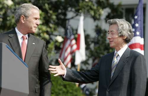 文章認為,“小泉布什組合”的共同表演,首先是提升同盟地位,擴展合作范圍。日美首腦發(fā)表的題為《新世紀的日美同盟》的一份聯(lián)合文件稱,兩國擁有共同的價值觀,擁有共同的利益,肩負共同應對亞太地區(qū)安全環(huán)境變化帶來挑戰(zhàn)的責任。顯然,提升和擴展同盟關系是美日兩國出于自身利益的共同需求。一家日本媒體說得很直白:“新世紀的日美同盟就是要將日美兩國的軍事合作擴大到全球范圍”。從美方而言,期待日本對于美國全球戰(zhàn)略保持亦步亦趨的同時,繼續(xù)發(fā)揮無可替代的“取款機”作用。從日方而言,已經(jīng)無意自行構筑外交方略,只是一心借助美國保駕護航,不斷突破傳統(tǒng)框架和憲法束縛,謀求早日成為政治大國。當然,布什破格接待小泉的用意,除了表示安撫和贊賞之外,還希望對小泉后任產(chǎn)生示范作用:像小泉那樣言聽計從。