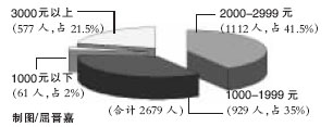 截至昨日,網(wǎng)上調(diào)查問及作為一名大學生,希望工作單位給予怎樣的報酬時?參加投票的2679人中,選擇2000元—2999元的最多,為1112人;929人選擇1000元—1999元,選擇1000元以下的為61人,有577人期望3000元以上月薪,即近八成(78%)畢業(yè)生期望月薪在3000元以下。