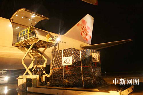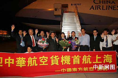 兩岸首班專案貨運(yùn)包機(jī)——臺(tái)灣“中華航空公司”CI六九○一航班于七月二十日凌晨零時(shí)三十三分飛抵上海浦東機(jī)場(chǎng)。浦東機(jī)場(chǎng)拉出了歡迎華航貨機(jī)的橫幅,上書“熱烈歡迎中華航空貨機(jī)首航上海”。潘索菲 攝