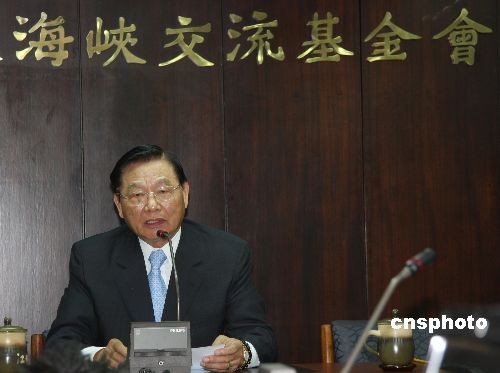 10月21日中午,臺灣;鶗麻L江丙坤召開臨時記者會,譴責(zé)暴力襲擊來臺灣進(jìn)行學(xué)術(shù)訪問的海協(xié)會副會長、廈門大學(xué)傳播學(xué)院院長張銘清。中新社發(fā) 耿軍 攝