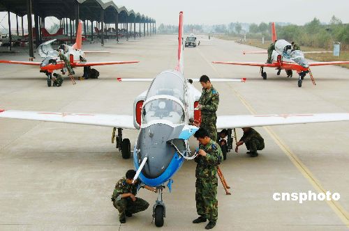 圖為10月22日,濟(jì)空某飛行學(xué)院飛行訓(xùn)練現(xiàn)場(chǎng)一組鏡頭。擔(dān)負(fù)培養(yǎng)和造就高素質(zhì)新型飛行人才重任的濟(jì)空某飛行學(xué)院,在飛行人員中開(kāi)展“一心一意跟黨走、苦練精飛謀打贏”的主題活動(dòng),在機(jī)務(wù)和后勤官兵中開(kāi)展“立足本職作貢獻(xiàn)、再接再厲立新功”為主題的崗位練兵和安全競(jìng)賽活動(dòng),把學(xué)習(xí)十七大精神的政治熱情轉(zhuǎn)化到“牢記使命責(zé)任,苦練打贏本領(lǐng)”的具體行動(dòng)中。中新社發(fā) 耿國(guó)慶 攝