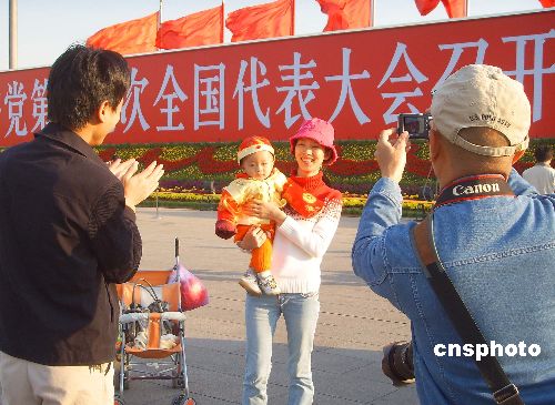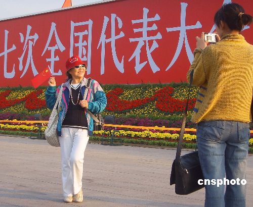 10月21日上午,黨的“十七大”在北京勝利閉幕,來(lái)自四面八方的游客感到無(wú)比高興、鼓舞,紛紛快樂(lè)地在花團(tuán)錦簇的北京天安門(mén)廣場(chǎng)拍照留影,記錄下這有意義的時(shí)刻。中新社發(fā) 玉龍 攝