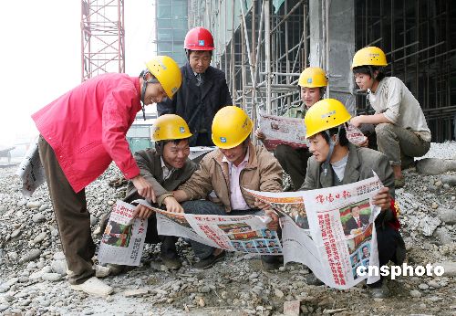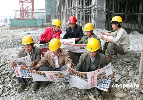 10月23日上午,綿陽(yáng)長(zhǎng)虹工業(yè)園虹歐PDP項(xiàng)目建筑工地,中建公司的農(nóng)民工在閱看《綿陽(yáng)日?qǐng)?bào)》有關(guān)十七大的報(bào)道。他們看到十七大報(bào)告中關(guān)于完善和落實(shí)國(guó)家對(duì)農(nóng)民工的政策,依法維護(hù)勞動(dòng)者權(quán)益等內(nèi)容后喜笑顏開(kāi),表示將安全生產(chǎn),把工程項(xiàng)目盡快完成,為祖國(guó)建設(shè)貢獻(xiàn)自己的力量。中新社發(fā) 蒲滔 攝
