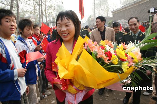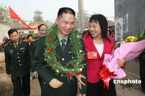 10月23日,出席黨的十七大的河南代表團代表吳新芬回到家鄉(xiāng)禹州市朱閣鄉(xiāng)邊樓村,受到家鄉(xiāng)父老的熱情歡迎,當日她就把黨的十七大的精神與鄉(xiāng)親們分享。十七大代表吳新芬,是一名來自河南省禹州市朱閣鄉(xiāng)邊樓村的軍人媳婦。1998年,大學畢業(yè)不久,當她得知西藏某部邊防軍官王俊景在執(zhí)行任務時被高壓電擊成重傷,便毅然辭去工作,跑到醫(yī)院照顧,不久后兩人成為伴侶。此后10年,她和丈夫共用一雙手,一起跨越常人難以想象的重重困難,艱苦而幸福地生活。中新社發(fā) 牛書培 攝
