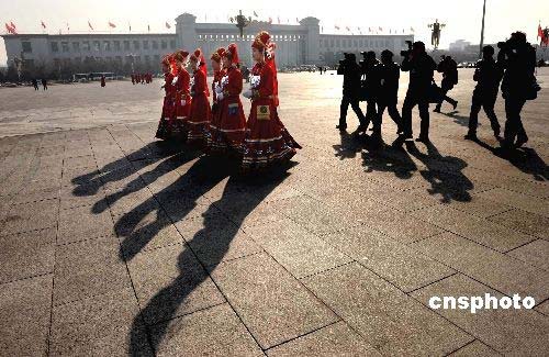 三月五日上午九時(shí),十一屆全國(guó)人大一次會(huì)議在北京人民大會(huì)堂隆重開幕。攝影記者在天安門廣場(chǎng)窮追不舍拍攝穿著少數(shù)民族服飾的亮麗女服務(wù)員。中新社發(fā) 廖攀 攝