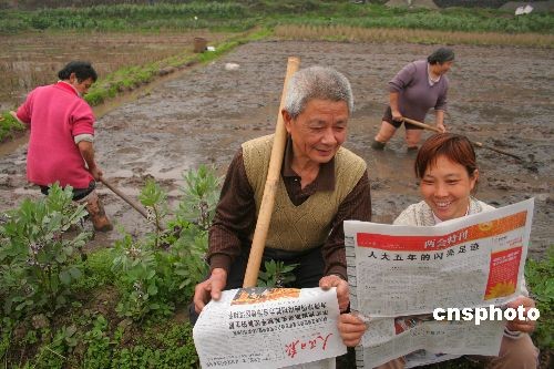 3月5日,重慶榮昌縣杜家壩村農(nóng)民在春耕的休息間隙,一起閱讀登載有兩會(huì)消息的人民日?qǐng)?bào)。連日來(lái)人民日?qǐng)?bào)上“兩會(huì)特刊”中有關(guān)農(nóng)民生產(chǎn)、糧食生產(chǎn)與新農(nóng)村建設(shè)等方面的相關(guān)信息,引起當(dāng)?shù)卮焊r(nóng)民的密切關(guān)注。中新社發(fā) 朱蕓鋒 攝