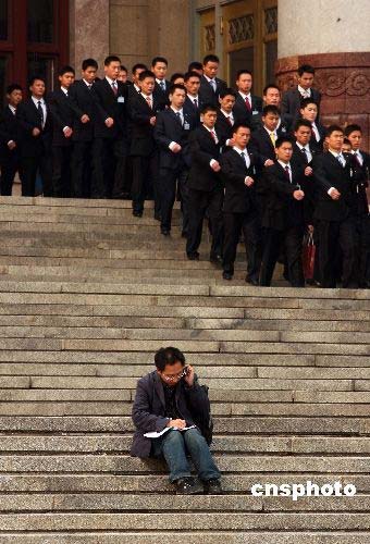 三月八日上午,全國(guó)政協(xié)十一屆一次會(huì)議第二次全體會(huì)議在北京人民大會(huì)堂舉行,十四位政協(xié)委員圍繞經(jīng)濟(jì)建設(shè)和社會(huì)建設(shè)等問(wèn)題作大會(huì)發(fā)言。會(huì)后,一名忙碌的記者坐在臺(tái)階上與列隊(duì)而出的兩會(huì)服務(wù)人員相映成趣。中新社發(fā) 盛佳鵬 攝
