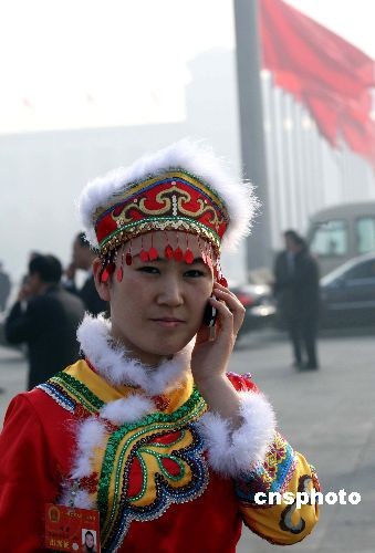 三月十日,十一屆全國(guó)人大一次會(huì)議在北京舉行第三次全體大會(huì),中國(guó)人口最少的民族之一赫哲族全國(guó)人大代表劉蕾邊打手機(jī)邊走向會(huì)場(chǎng)。赫哲族生活在中國(guó)東北的黑龍江省,人口只有4千多。劉蕾年僅24歲,屬于“80后”,是唯一的赫哲族全國(guó)人大代表。中新社發(fā) 任海霞 攝