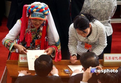 3月17日下午,十一屆全國人大一次會議在北京人民大會堂舉行第七次全體會議,決定國務(wù)院副總理、國務(wù)委員、各部部長、各委員會主任、中國人民銀行行長、審計(jì)署審計(jì)長及國務(wù)院秘書長人選;表決全國人大各委員會主任委員、副主任委員、委員名單草案。在投票表決間隙,一些全國人大代表抓緊時(shí)機(jī)在各代表團(tuán)坐席請省領(lǐng)導(dǎo)簽名留念。 中新社發(fā) 張宇 攝