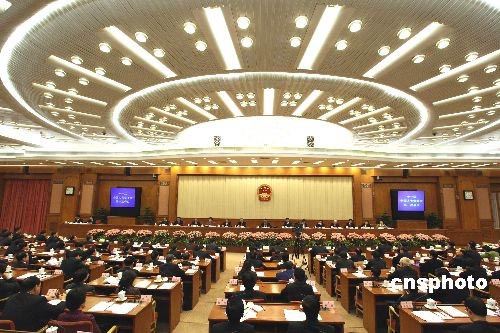 第十一屆全國(guó)人民代表大會(huì)常務(wù)委員會(huì)第一次會(huì)議3月19日上午在北京人民大會(huì)堂舉行,會(huì)議通過(guò)任命王萬(wàn)賓、喬曉陽(yáng)、張少琴、曹衛(wèi)洲、王慶喜、李連寧、何曄暉(女)、孫偉、劉振偉為全國(guó)人民代表大會(huì)常務(wù)委員會(huì)副秘書(shū)長(zhǎng),吳邦國(guó)委員長(zhǎng)發(fā)表講話。中新社發(fā) 任晨鳴 攝