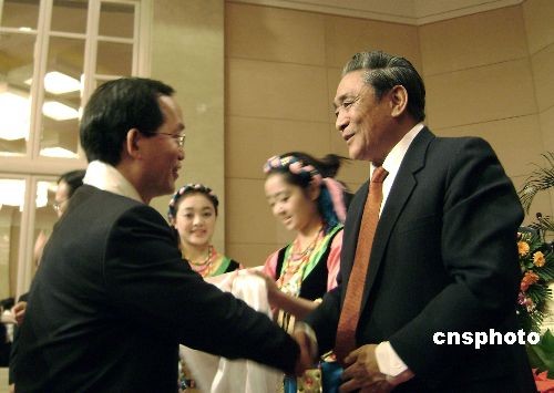 原全國(guó)人大常委會(huì)副委員長(zhǎng)、西藏自治區(qū)發(fā)展咨詢委員會(huì)名譽(yù)主任熱地十九日在北京說(shuō),西藏實(shí)現(xiàn)良性發(fā)展,青藏鐵路是最有效的戰(zhàn)略依托。圖為他在西藏大廈為第二屆西藏自治區(qū)發(fā)展咨詢委員會(huì)委員獻(xiàn)哈達(dá),鼓勵(lì)五十九位知名專家學(xué)者為西藏發(fā)展建設(shè)服務(wù)。中新社發(fā) 劉舒凌 攝