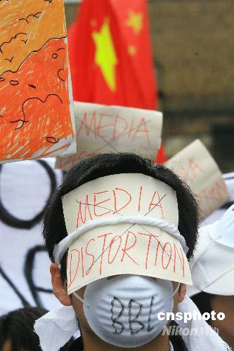 當?shù)貢r間19日,在英國學(xué)習(xí)、工作和定居的華人約2000多人在倫敦舉行靜默集會,抗議包括英國廣播公司(BBC)在內(nèi)的西方媒體對中國所做的不公正的、片面的報道。圖為一名示威者戴著口罩,抗議媒體歪曲報道。中新社發(fā) 李鵬 攝