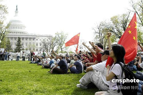 當(dāng)?shù)貢r(shí)間4月19日,近千名中國留學(xué)生和當(dāng)?shù)氐娜A僑華人在美國國會山前舉行示威活動,支持北京奧運(yùn),反對CNN丑化中國的評論。圖為千名留學(xué)生在國會山前振臂高呼:“不要歪曲報(bào)道!不要支持暴力!支持和平,支持奧運(yùn)!” 中新社發(fā) 邱江波 攝