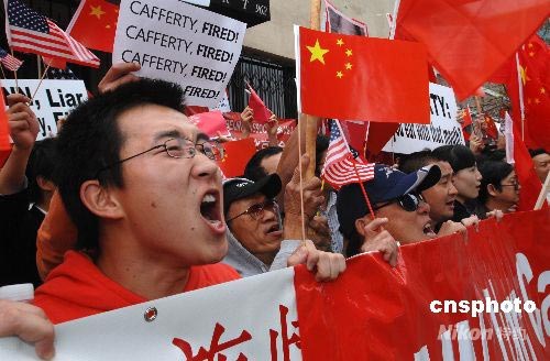 當?shù)貢r間4月19日上午,留學生張曉龍(前)與華人華僑一起高喊抗議口號。洛杉磯當天爆發(fā)十幾年來最大規(guī)模的華人華僑抗議示威活動。數(shù)千名華人華僑和留學生在CNN洛杉磯分部門前參加和平示威,要求CNN向公開鄭重道歉,并開除卡弗蒂。中新社發(fā) 張煒 攝