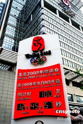 4月30日上午,顯示距北京2008年奧運(yùn)會100天的北京奧運(yùn)大廈倒計(jì)時牌吸引記者拍攝。當(dāng)日京城隆重舉行系;顒,表達(dá)京城各界人士盼望北京奧運(yùn)會的喜悅心情。 中新社發(fā) 宋吉河 攝
