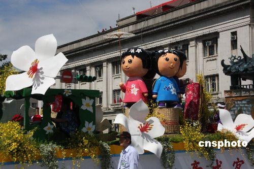 十日上午,一些推廣本地經(jīng)濟(jì)、文化特色的花車(chē),駛過(guò)臺(tái)北市區(qū)。圖中這輛由臺(tái)灣“客委會(huì)”布置的花車(chē)在宣傳如何弘揚(yáng)客家文化。中新社發(fā) 耿軍 攝