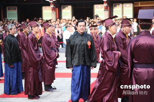 臺北孔廟五日清晨舉行孔子誕辰釋奠典禮。臺北市長郝龍斌擔(dān)任主祭官,臺北市政府民政局局長黃呂錦茹擔(dān)任糾儀官。馬英九身穿紫色長袍、黑色馬褂,進(jìn)入大成殿,向孔子行上香禮,向孔子行三鞠躬,司儀恭讀馬英九的祝文。馬英九還獻(xiàn)上寫有“道貫德明”的匾額。