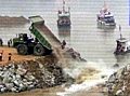 圖:三峽導(dǎo)流明渠截流上游圍堰開始截流