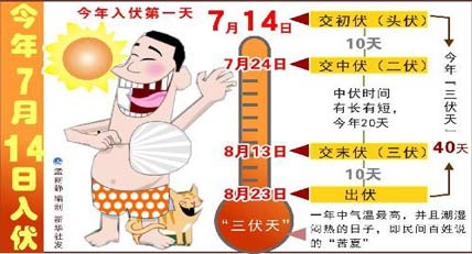 三伏天是按照我國古代的“干支紀(jì)日法”確定的。每年夏至以后第三個庚日(指干支紀(jì)日中帶有“庚”字的日子)為初伏,第四個庚日為中伏,立秋后第一個庚日為末伏,合起來稱為三伏。按陽歷計算則出現(xiàn)在7月中旬到8月中旬。此時我國大部地區(qū)是一年中最熱的時節(jié)……