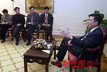 圖文:何厚鏵接受內(nèi)地傳媒集體采訪2 2000年12月14日 14:34 ![]() 在澳門回歸祖國一周年之際,行政長(zhǎng)官何厚鏵十三日在禮賓府接受內(nèi)地傳媒集體采訪。中新社傳真 宗金柱攝