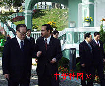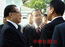 ![]() 國(guó)家主席江澤民21日上午在澳門住宅博物館聽取臨時(shí)海島市政局執(zhí)委會(huì)主席、土生葡人馬家杰介紹情況。中新社傳真 董會(huì)峰 攝 |