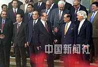 中國國家主席江澤民二十六日在海南博鰲水城集體會見出席亞洲論壇的貴賓,與亞洲論壇前政要們在一起。中新社記者 賈國榮 攝