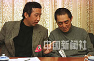 中國著名電影導(dǎo)演馮小寧與張藝謀,十一日參加全國政協(xié)九屆四次會議文藝組討論時,相互切磋拍攝手法。中新社記者 劉可耕 攝