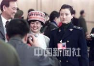 九屆全國(guó)人大四次會(huì)議第五次全體會(huì)議十五日上午在北京人民大會(huì)堂舉行,出席會(huì)議的少數(shù)民族代表與著名歌唱演員宋祖英合影。中新社記者 毛建軍 攝