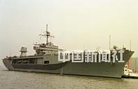 由美國第七艦隊司令梅茨格中將率領(lǐng)的美國海軍“藍(lán)嶺”號兩棲指揮艦,二十三日抵達(dá)上海訪問。圖為第七艦隊旗艦“藍(lán)嶺”號駛?cè)肷虾8哧柭反a頭。中新社圖 潘亞萍 攝