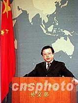 中國外交部發(fā)言人朱邦造四月三日在北京的記者招待會(huì)上,談到美國偵察機(jī)一日撞毀中國軍用飛機(jī)事件時(shí)說,中國海軍正在全力搜救我方落海飛行員。中新社記者 鄒憲 攝